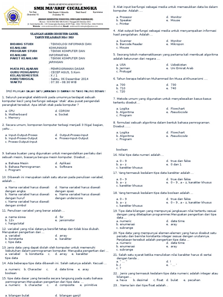 Pemrograman web diambil dari 2 suku kata yaitu pemrograman dan web. Soal jawaban pemprogaman dasar kelas x tkj semester 1 smk islam 1 blitar oleh charlos hima irawan bab01 alur. Apabila yang terbawa hanya sebuah kantong dan di katakan bukan kantong p yang terbawa, maka jumlah kelereng yang terbawa adalah : Download pdf pemrograman dasar x semester 1 unknown juli 21, 2017 admin bandung indonesia. Sebuah prosedur langkah demi langkah yang pasti untuk menyelesaikan sebuah masalah disebut e.